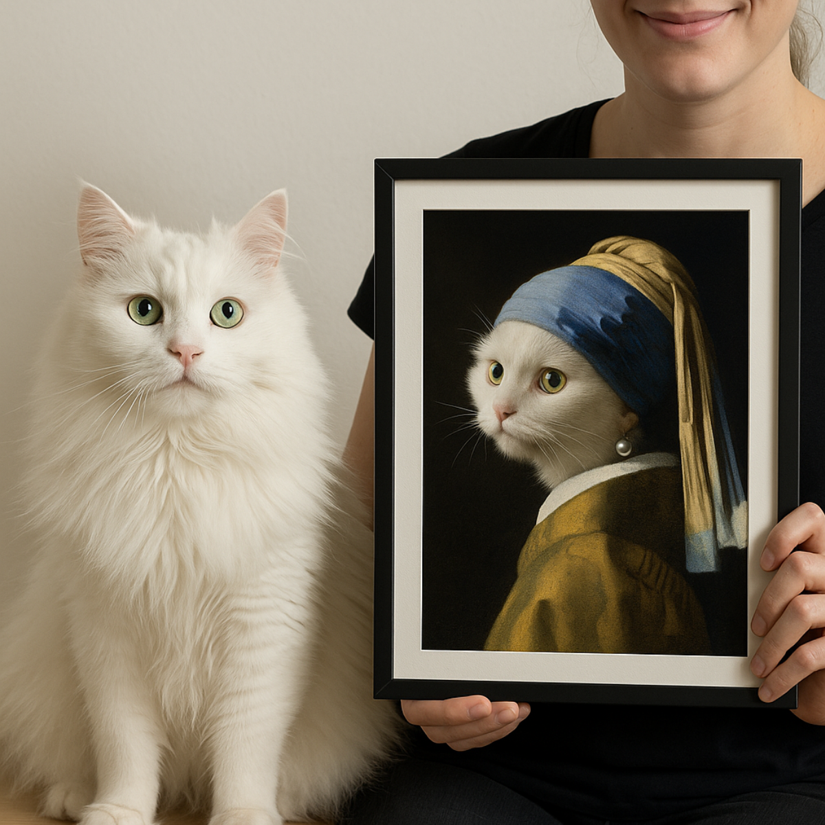 İnci Küpeli Kız tablosuna uyarlanmış kedi portresi, gerçek kedisiyle birlikte çerçeveli olarak sunulmuş