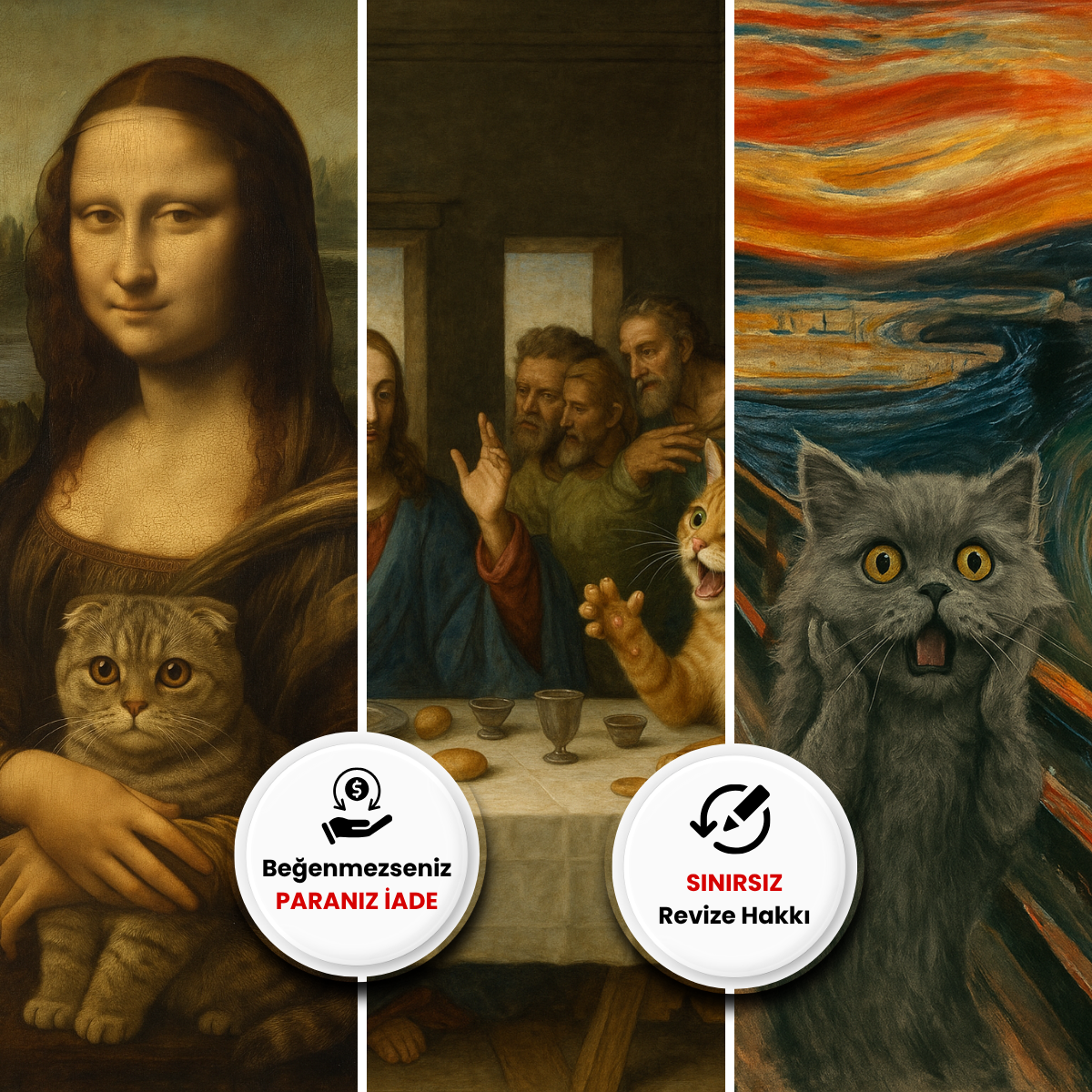 Evcil hayvanınızın yüzünü Mona Lisa, Çığlık veya Son Akşam Yemeği gibi dünyaca ünlü sanat eserleriyle birleştiriyoruz. Dijital olarak teslim edilen bu özel tasarım, hem baskıya hem dijital kullanıma uygundur. Üstelik 6-12 saatte hazır!