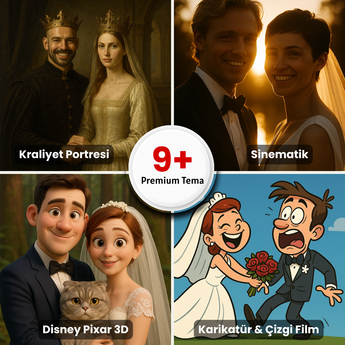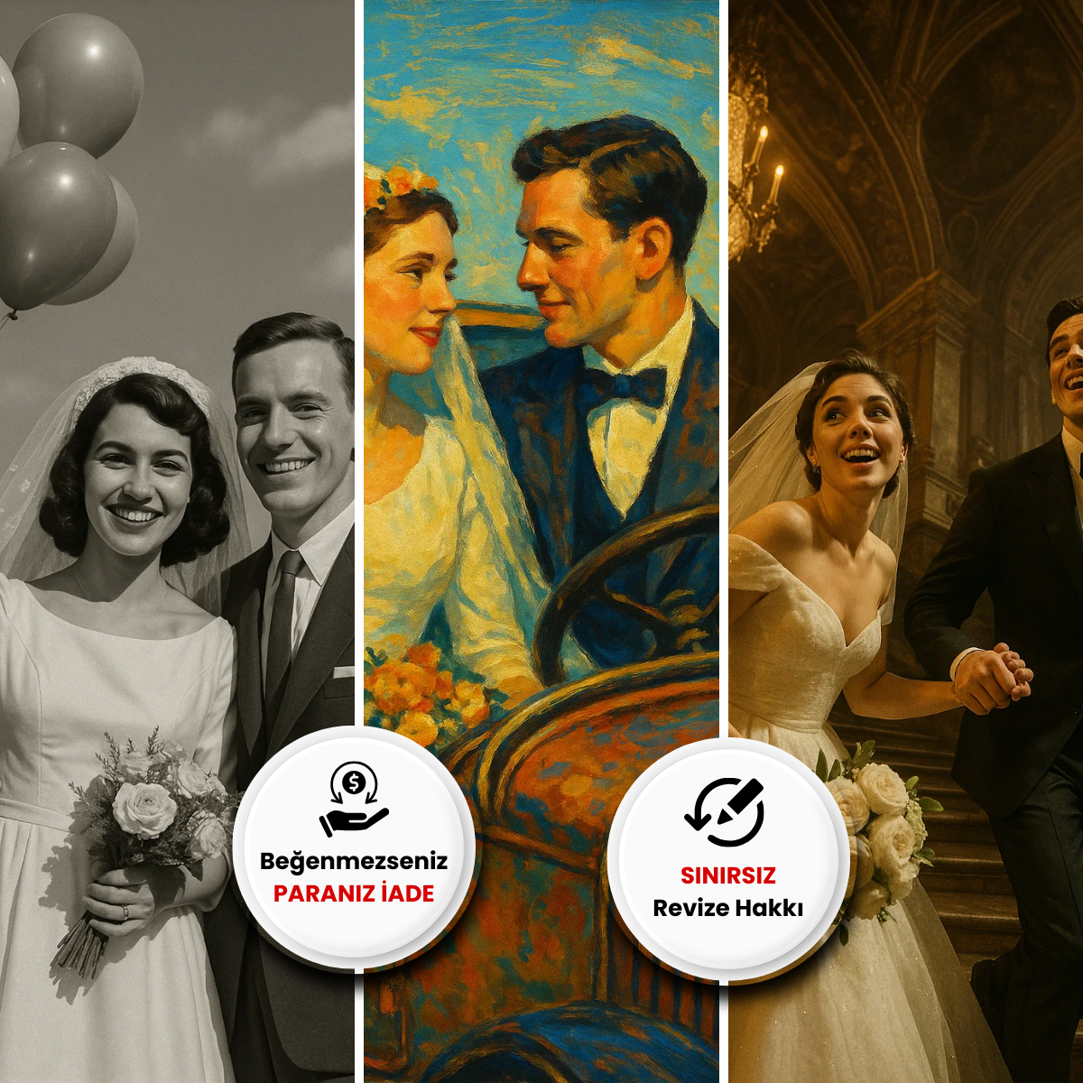 Geçmişin zarafetini ve 1950’ler vintage havasını bugüne taşımaya ne dersiniz? Gelin ve damat için nostaljik bir dokunuş ekleyen bu retro tarzı dijital portre, aşkınızı geçmişin zarafetiyle ölümsüzleştiriyor.