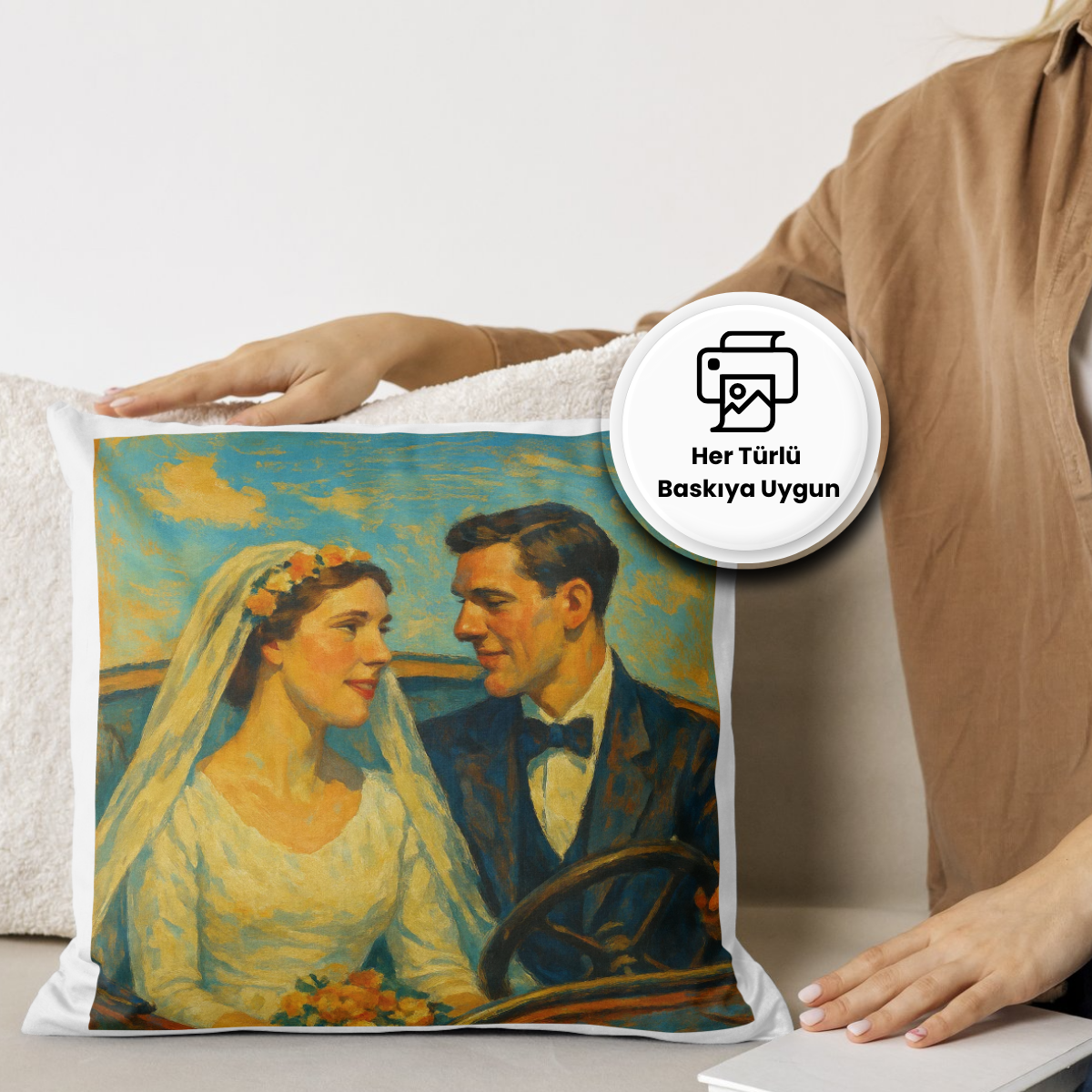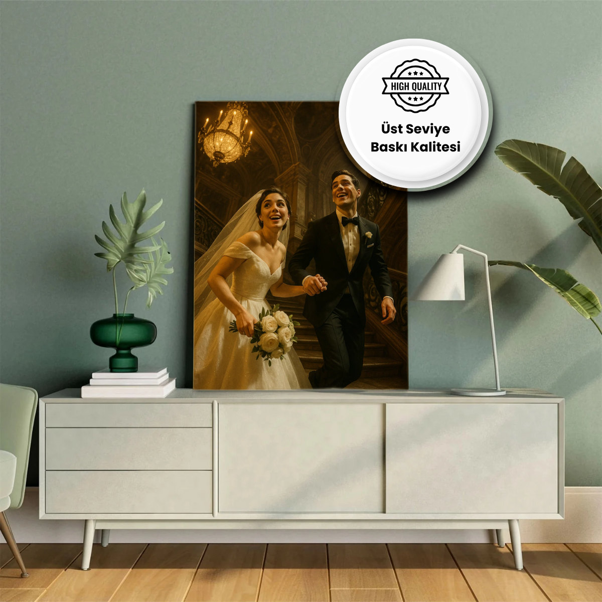 Portre, retro tarzını ve vintage estetiğini mükemmel bir şekilde harmanlayarak, her çiftin kendi hikayesini geçmişin güzellikleriyle hatırlamalarını sağlar. Baskıya uygun yüksek çözünürlük ile, ölümsüzleşen anınızı istediğiniz boyutlarda baskıya alabilirsiniz. Ürün, sadece görsel bir sanat eseri değil, aynı zamanda duygusal bir anlam taşıyor. Her fırça darbesi, size ve eşinize ait olan o özel anı sanatla ölümsüzleştiriyor.