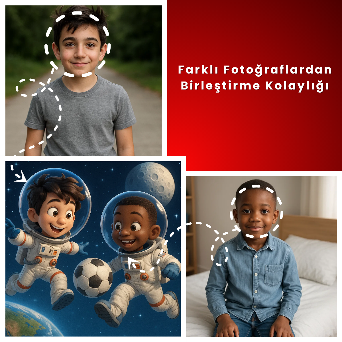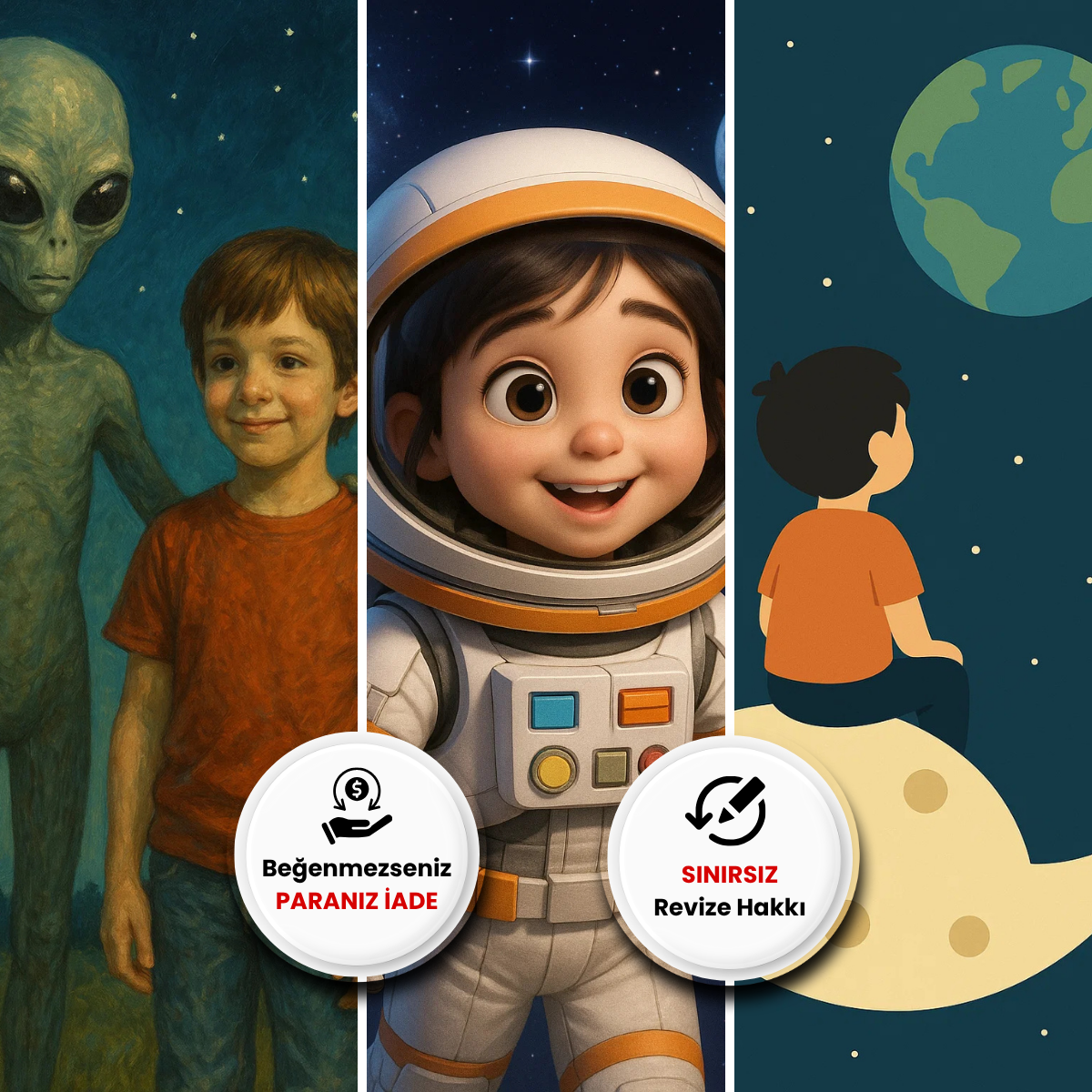 Çocuğunuz için uzay, astronot ve evren temalı kişiye özel dijital tasarımlar! Çocuğunuzun fotoğrafını gönderin, sevdiği uzay karakterlerini, astronot kıyafetlerini ve evren detaylarını belirleyin, biz de onu uzay yolculuğuna çıkaralım! Kişiye özel dijital tasarım ile çocuğunuzun astronot karakterini yaratıyoruz. 6-12 saat hızlı teslimat garantisiyle!